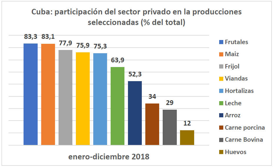 Los productores privados aportan una parte decisiva de importantes renglones de la oferta nacional de alimentos. En siete categorías claves (frutales, maíz, frijol, viandas, hortalizas, lecha y arroz) la contribución del sector privado supera el 50%.