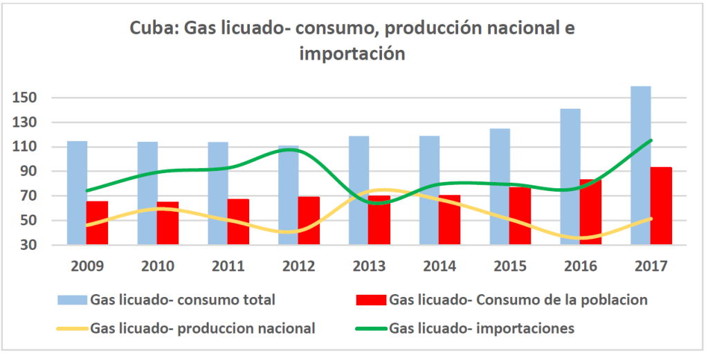 El modelo de consumo de GLP de Cuba depende en alto grado de las importaciones. Estas redujeron el peso desproporcionadamente alto que tuvieron en 2013 y desde entonces la cifra ha oscilado, con un incremento en 2017.